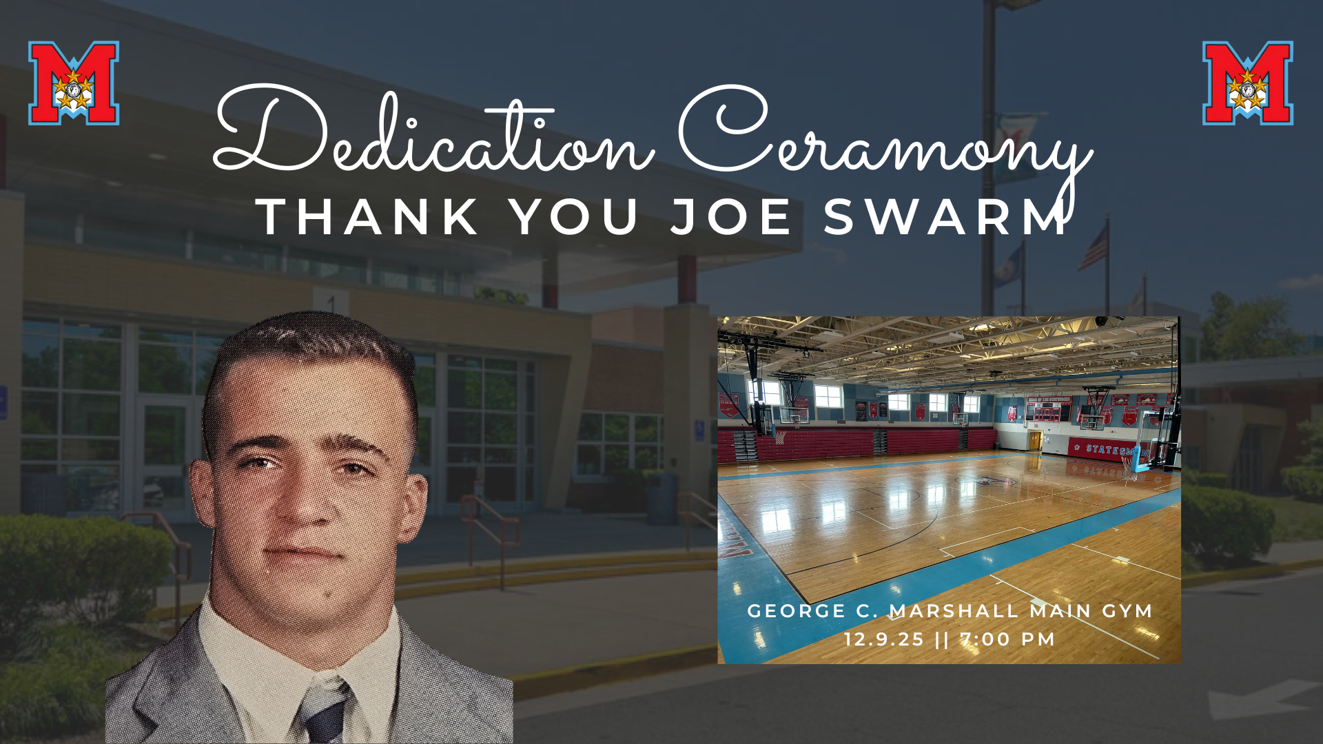 Join us tonight as we celebrate our former Marshall Statesmen DSA Joe Swarm. Our gymnasium is named after Mr. Swarm for his 30+ years of service at GCM. Thanks Mr. Swarm!!
